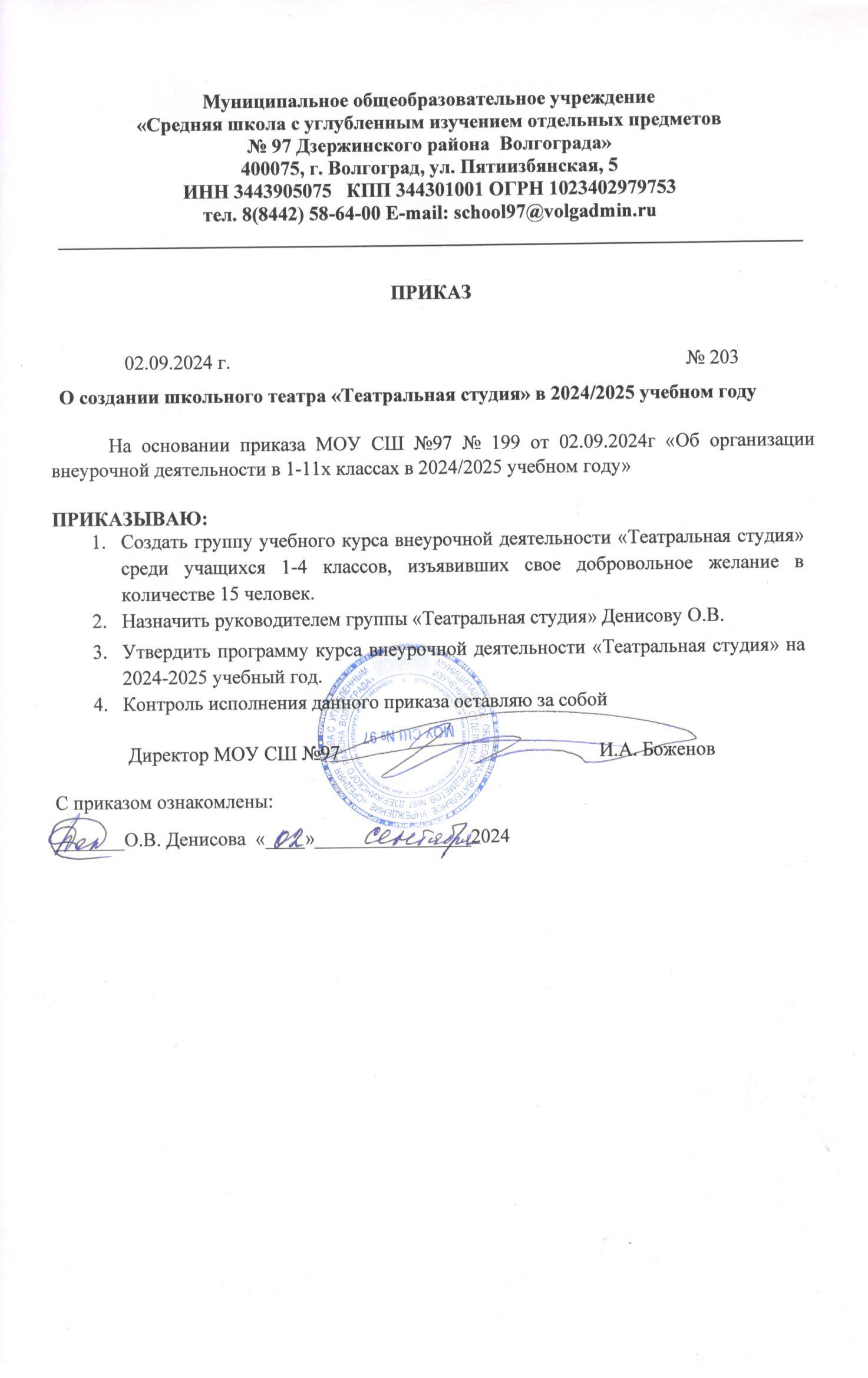 В нашей школе создан театр "Овация" согласно "Приказ о создании театра МОУ СШ № 97" № 203 от 02.09.2024 г.