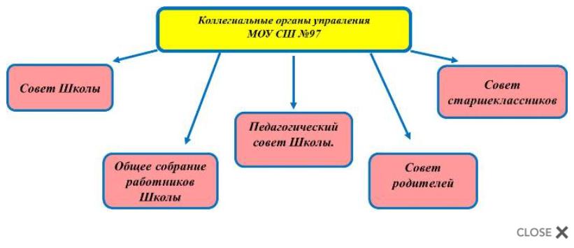 Управление МОУ СШ № 97 осуществляется в соответствии со ст. 26 и 27 федерального закона «Об образовании в Российской Федерации» и Уставом МОУ СШ № 97 на основе сочетания принципов единоначалия и коллегиальности.